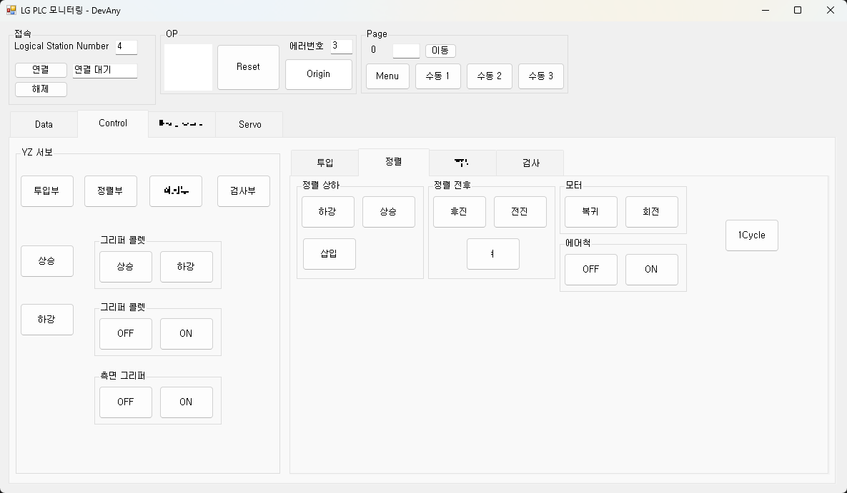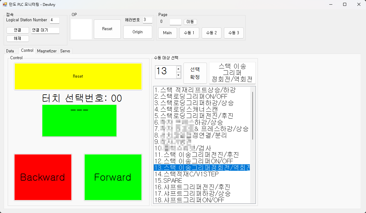 PLC와 연결된 터치패널(OP)의 위치 때문에 기계 세팅이 어려워 근접한 PC 터치 모니터를 사용하여 조작할 수 있도록 현장에서 제작한 프로그램.