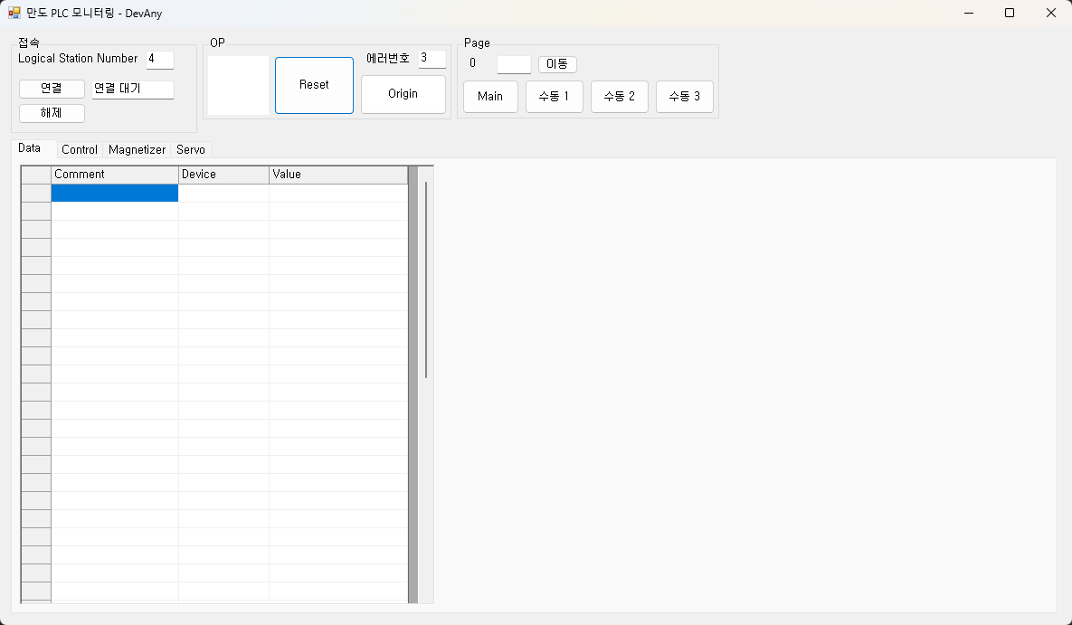 PLC와 연결된 터치패널(OP)의 위치 때문에 기계 세팅이 어려워 근접한 PC 터치 모니터를 사용하여 조작할 수 있도록 현장에서 제작한 프로그램.